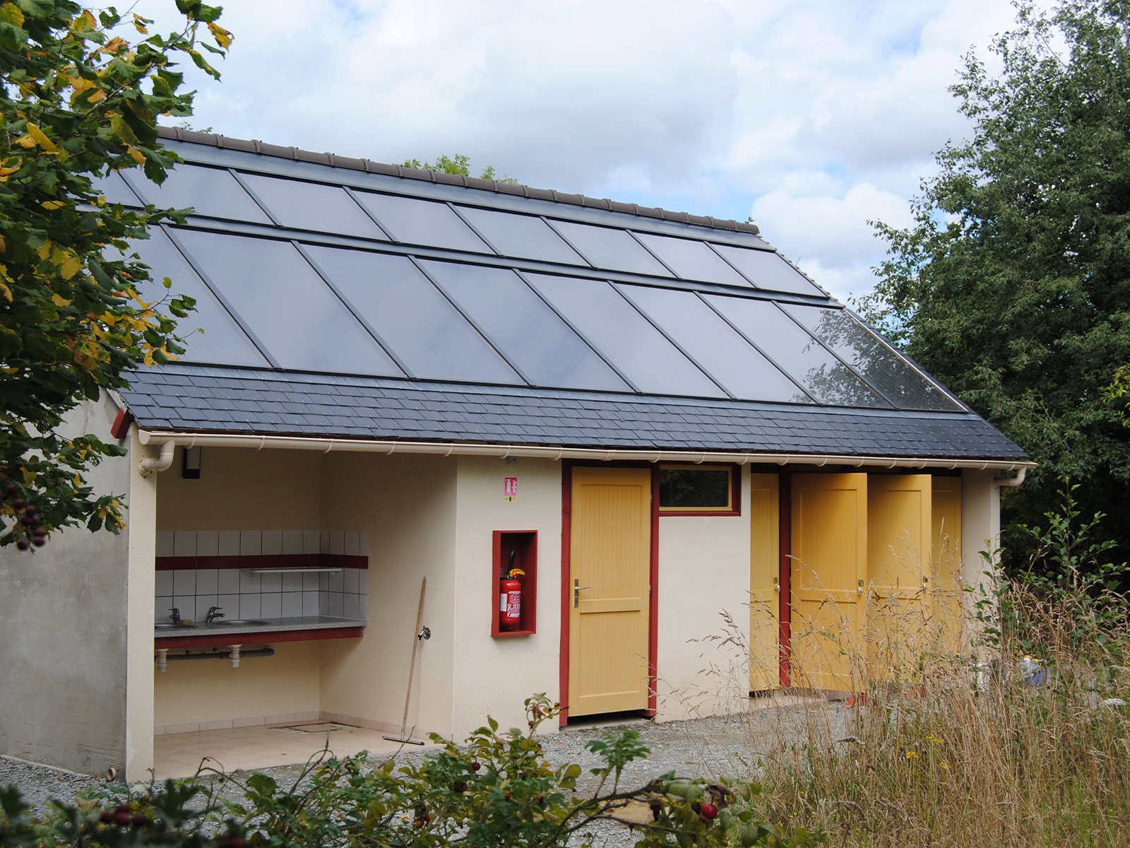 Le camping possède 2 sanitaires avec eau chaude gratuite dont 1 accessible aux personnes en situation de handicap. Pour notre besoin, 75% d'eau chaude est fourni par les panneaux solaires sur nos sanitaires.